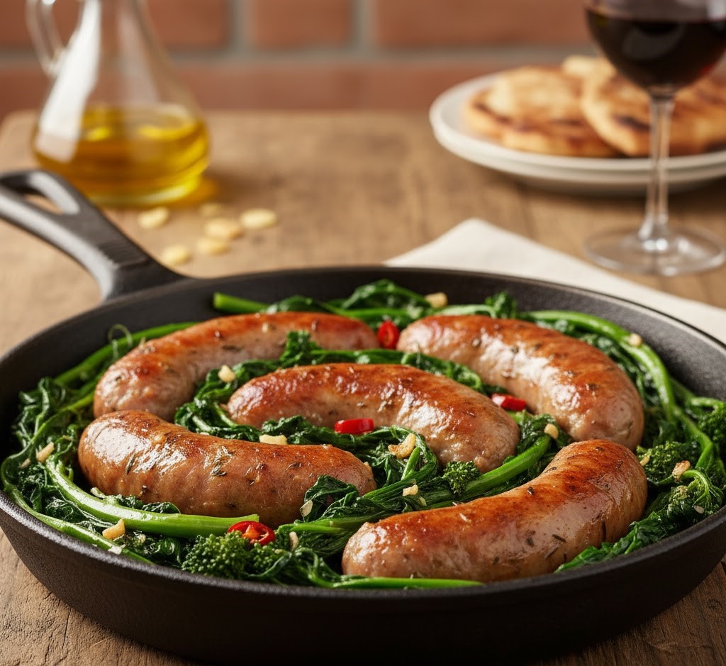 Es el matrimonio perfecto: salchichas frescas de cerdo doradas en sartén junto con los friarielli salteados.