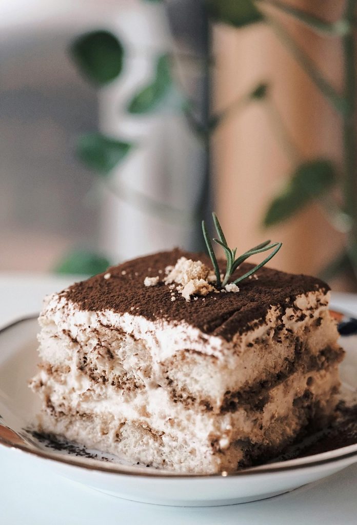 Tiramisú: Capas de bizcocho empapado en café con mascarpone y cacao.