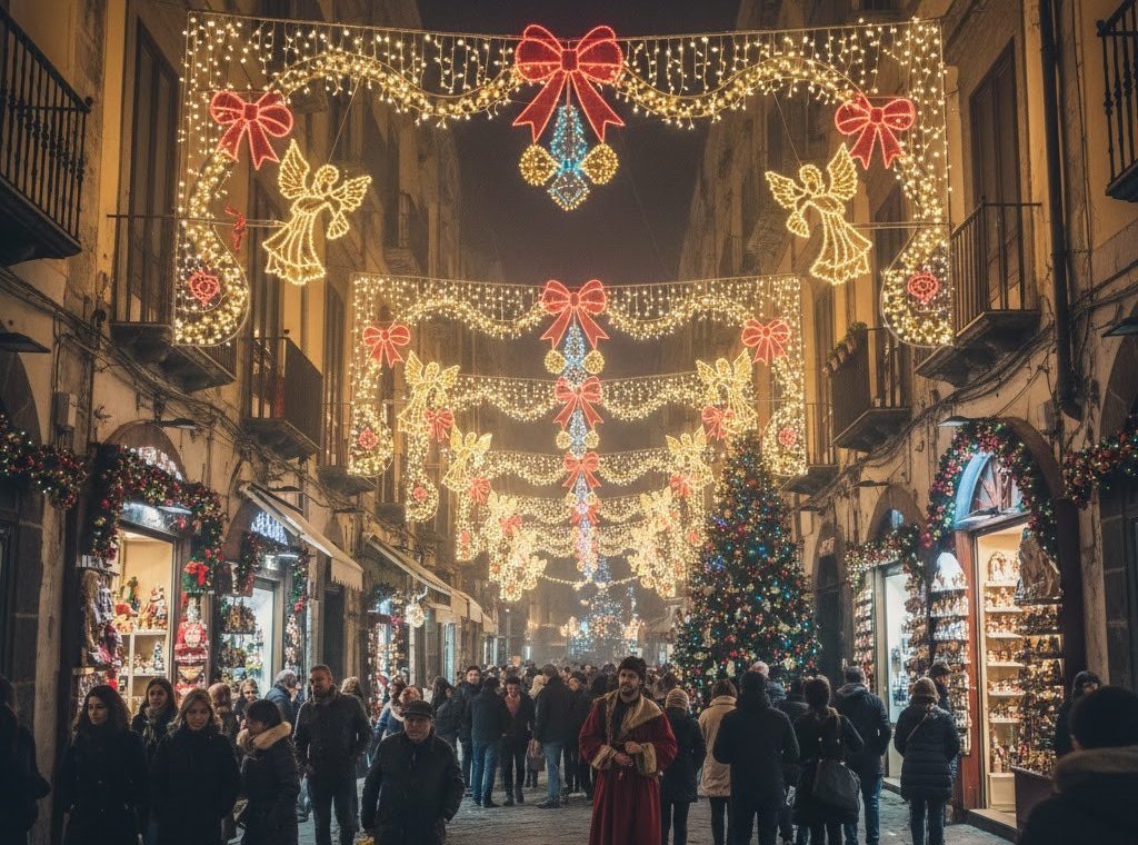 Las noches se llenan de campanas, fuegos artificiales y música popular, recordando que Nápoles celebra la Navidad como celebra la vida: con el alma abierta, el corazón lleno y las manos que siempre se alzan para compartir.